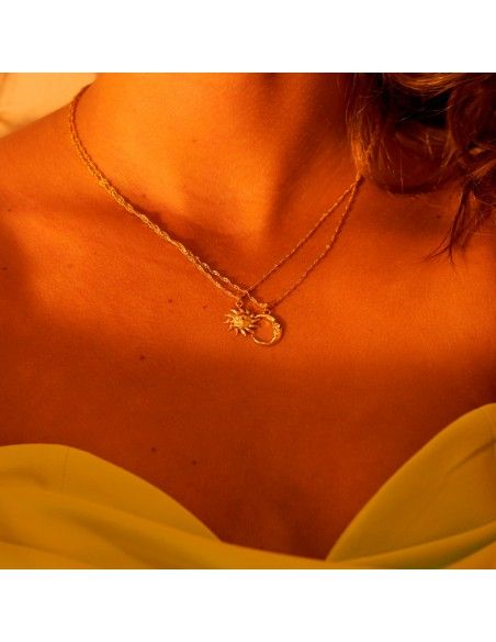 El collar Soleil es un imprescindible de esta temporada, perfecto con tu piel bronceada y con vestidos o blusas con escote. Combinable con otros collares y joyitas Malizzia.- Evitar usar productos como colonias, cremas o productos de limpieza sobre las joyas, puede hacer que pierdan su brillo o se oscurezcan.