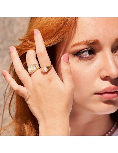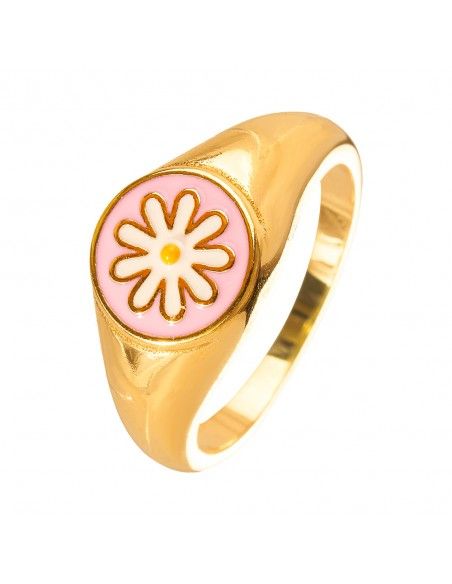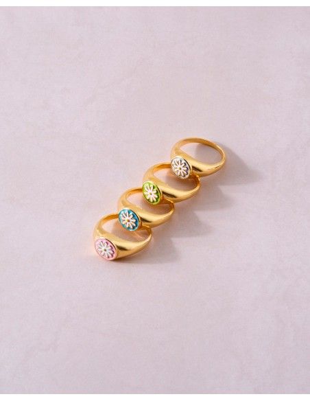¿Me quiere? ¿No me quiere? … La flor más sencilla y más bonita de todas es la margarita. En nuestro anillo Fiore hemos querido introducir toda la alegría de la primavera en tus manos. Combnina este anillo de sello con otros sellos a todo color como el Anillo Groovy. Su baño de 18 quilates no puede sentarle mejor a los colores de esmalte, ¿no crees? ¿Tienes dudas de qué talla de anillo usas? ¡Lee nuestra guía y sal de dudas!- Evitar usar productos como colonias, cremas o productos de limpieza sobre las joyas, puede hacer que pierdan su brillo o se oscurezcan.
