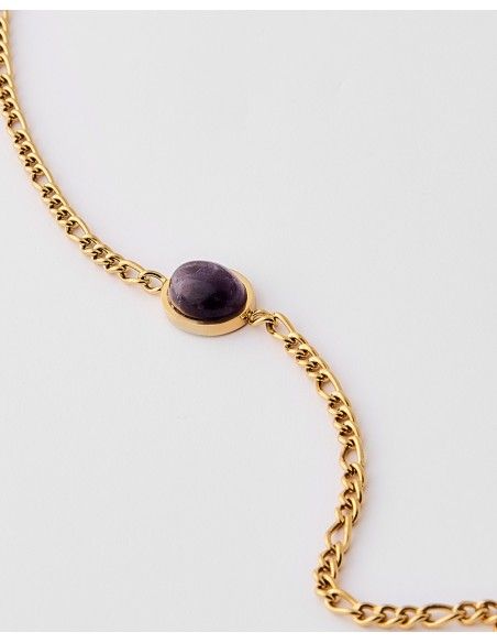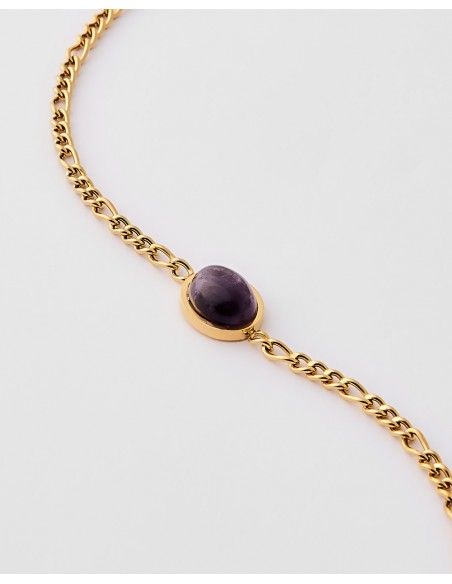 La pulsera Amethyst Dawn está fabricada en Acero Quirúrgico con baño de IP Gold. En el medio una piedra Amatista que aporta todo el color a la pieza. Sencilla y perfecta para llevar en el día a día. Además, es resistente al agua. ¡Llévala siempre contigo!- Evitar usar productos como colonias, cremas o productos de limpieza sobre las joyas, puede hacer que pierdan su brillo o se oscurezcan.