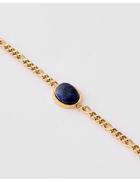 La pulsera Lapislázuli Dawn está fabricada en Acero Quirúrgico con baño de IP Gold. En el medio una piedra Lapislázuli que aporta todo el color a la pieza. Sencilla y perfecta para llevar en el día a día. Además, es resistente al agua. ¡Llévala siempre contigo!- Evitar usar productos como colonias, cremas o productos de limpieza sobre las joyas, puede hacer que pierdan su brillo o se oscurezcan.