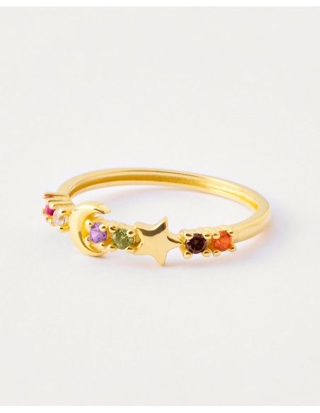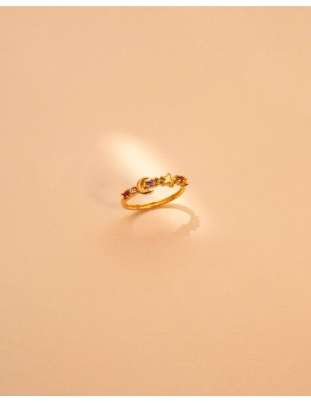 El anillo tender es como su propio nombre indica, una ternura. Circonitas multicolor combinadas con una luna y estrella de Oro Vermeil. El metal base es Plata de Ley pero tiene un baño de Oro de 18 quilates de 3 micras. Hiper resistente a todo.Es perfecto para combinar con otros anillos finitos si te gusta el look minimalista o con otros anillos de colores como el modelo Gardenia.