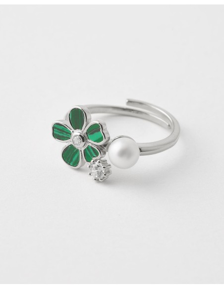 ANILLO ABIERTO FLOR MALAQUITA 10MM - PERLA 5MM