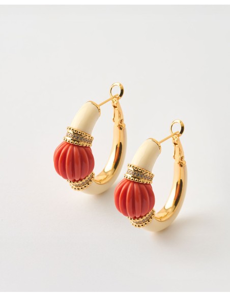 Pendientes Aro Ovalado 30mm Esmalte Naranja Y Blanco Circonitas Laton