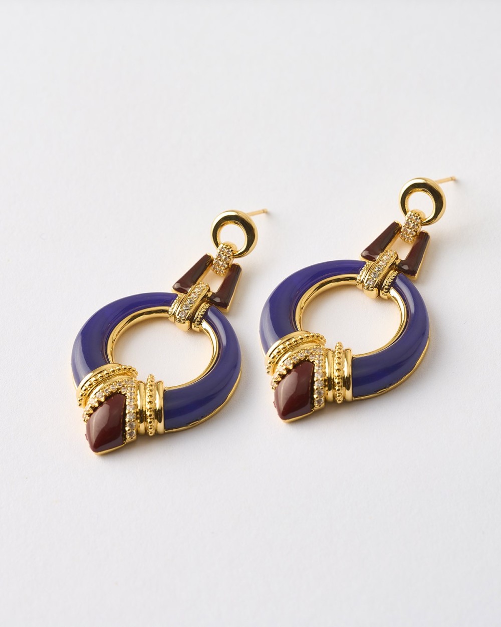 PENDIENTES LARGOS ARO ESMALTE AZUL Y CHOCOLATE Y CIRCONITAS