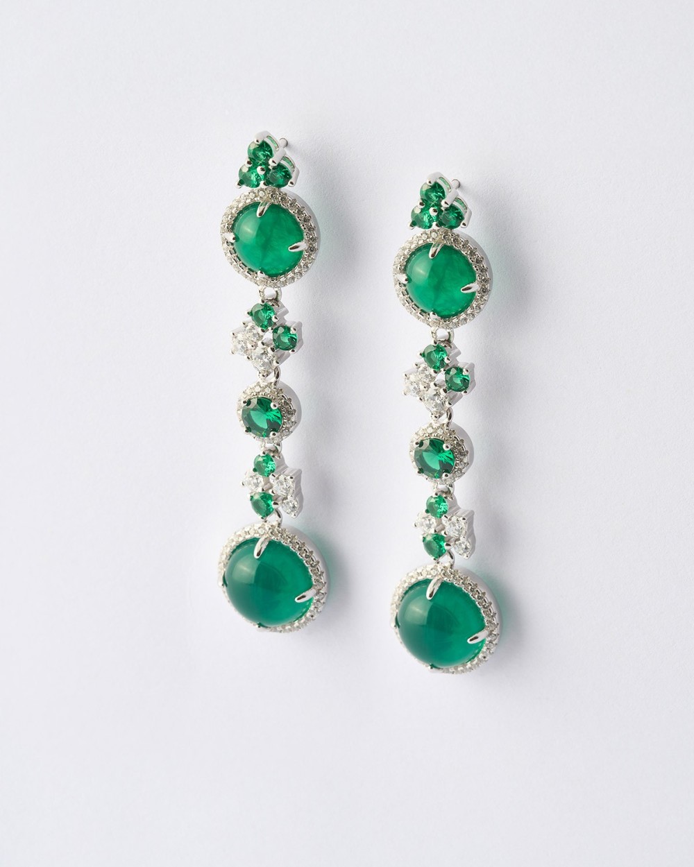 PENDIENTES LARGOS CIRCULOS Y FLORES CIRCONITAS ESMERALDA Y BALNCAS