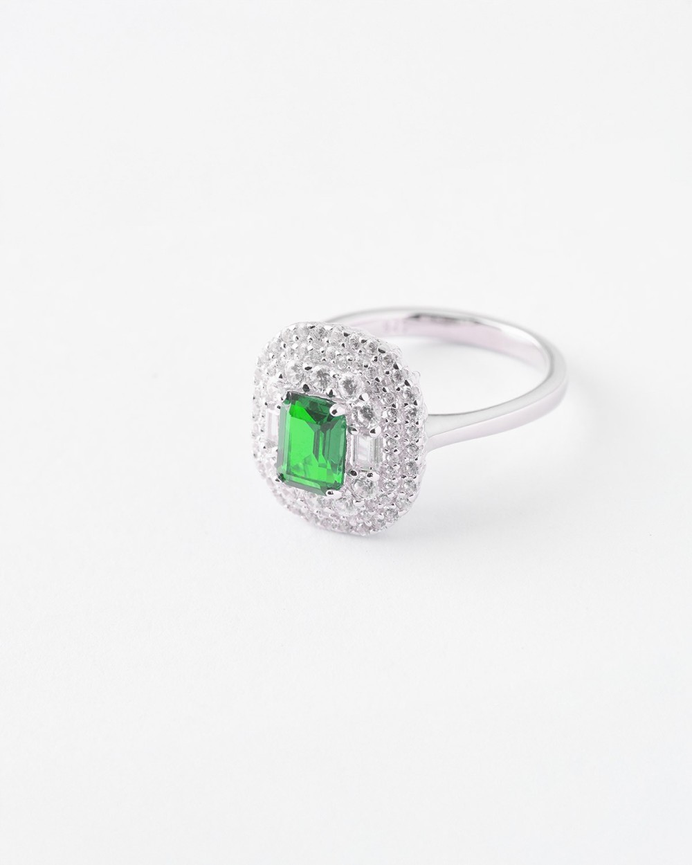 Anillo Circonita Esmeralda Central 7x5mm Triple Halo Circonitas Blancas Plata